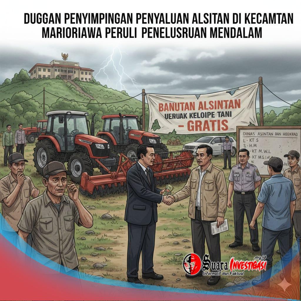 SUARA INVESTIGASI, Soppeng- Penyaluran bantuan alat dan mesin pertanian (alsintan) berupa traktor roda empat, rotavator (roltivator), serta combine harvester di Kecamatan Marioriawa, Kabupaten Soppeng, menjadi sorotan publik. Informasi ini diperoleh dari sejumlah sumber yang enggan disebutkan namanya, dan saat ini berkembang luas di tengah masyarakat tani.