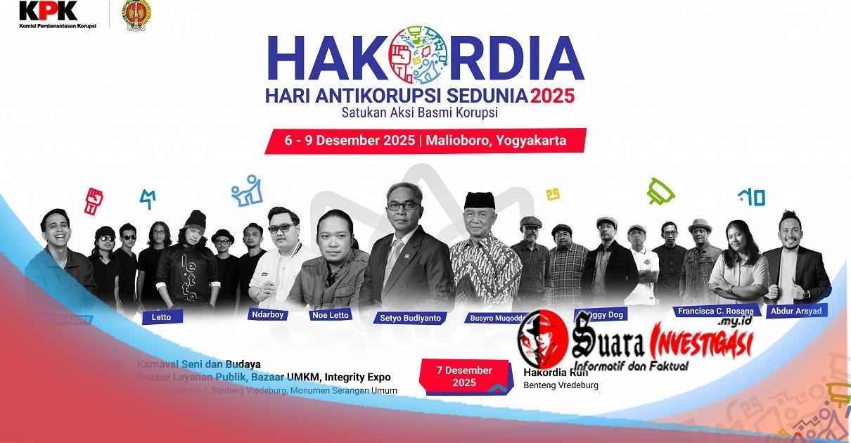 SUARA INVESTIGASI, JAKARTA | Jakarta, 5 Desember 2025 — Komisi Pemberantasan Korupsi (KPK) resmi mengumumkan pelaksanaan Hari Antikorupsi Sedunia (HAKORDIA) 2025 yang akan digelar di Daerah Istimewa Yogyakarta pada 6–9 Desember 2025. Mengusung tema “Satukan Aksi, Basmi Korupsi”, HAKORDIA 2025 menjadi gerakan kolaborasi nasional yang melibatkan berbagai elemen bangsa.